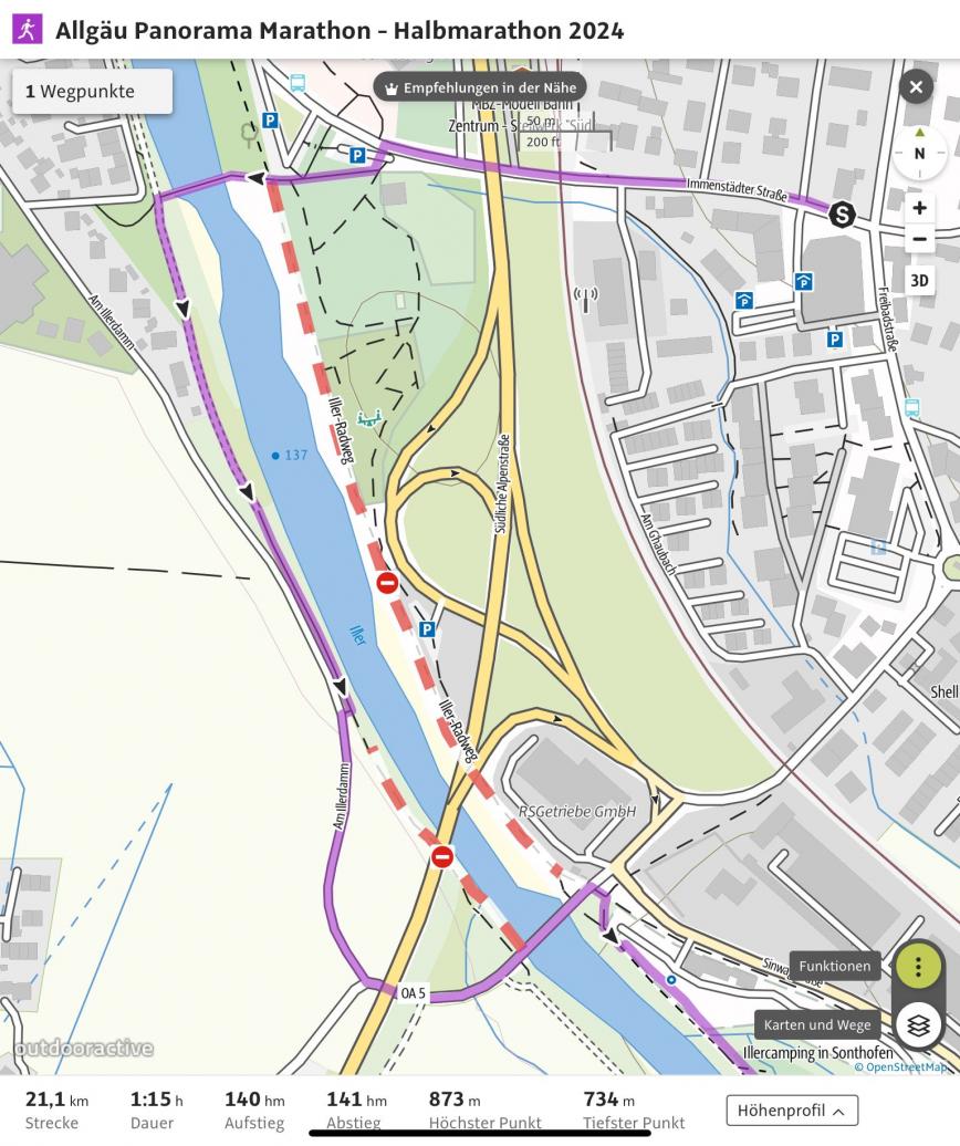 Der Wendepunkt wird etwas nach vorne verlegt, um die Extrameter der Ausweichstrecke zu kompensiere. Es bleibt natürlich bei den 21.1km.